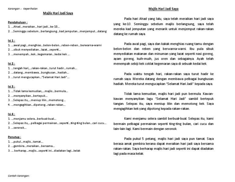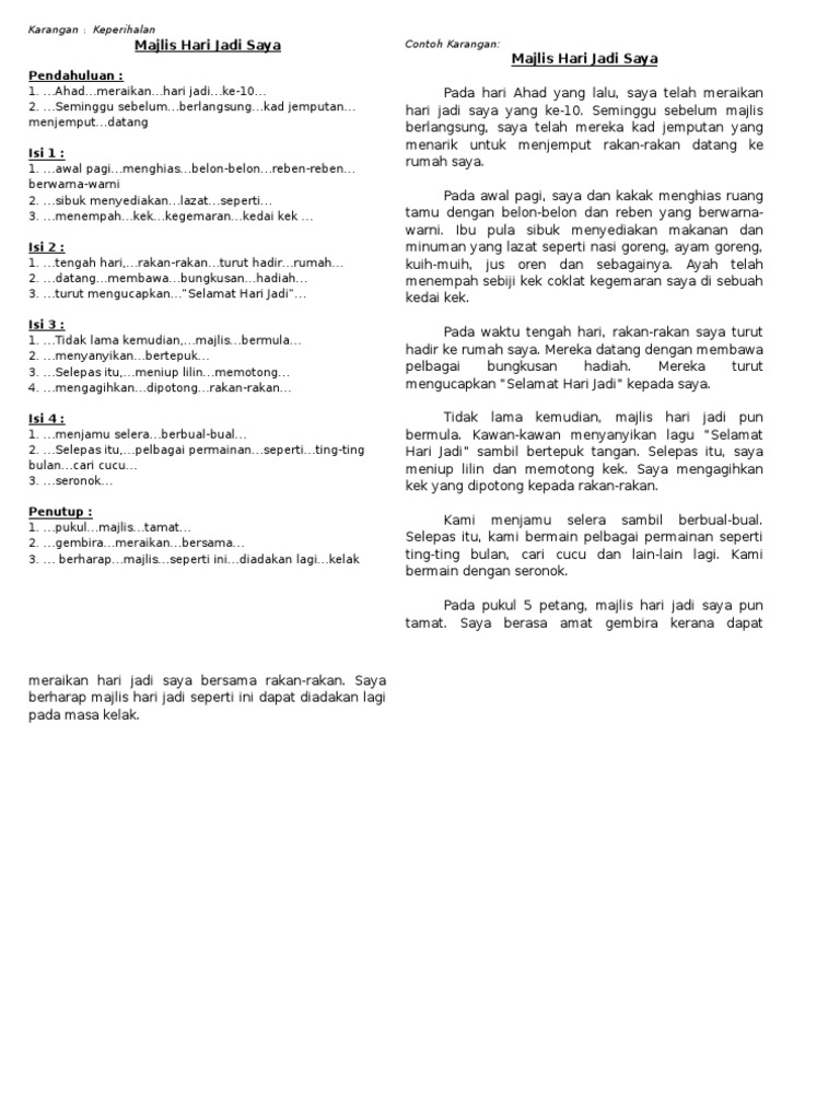 Majlis Hari Lahir Saya Pada hari minggu yang lepas saya telah meraikan hari jadi saya yang ke-12 di rumah saya. Add to my workbooks 0 Embed in my website or blog Add to Google Classroom Add to Microsoft Teams Share through Whatsapp. Cuba untuk menulis esei kepada saya berdasarkan contoh karangan.